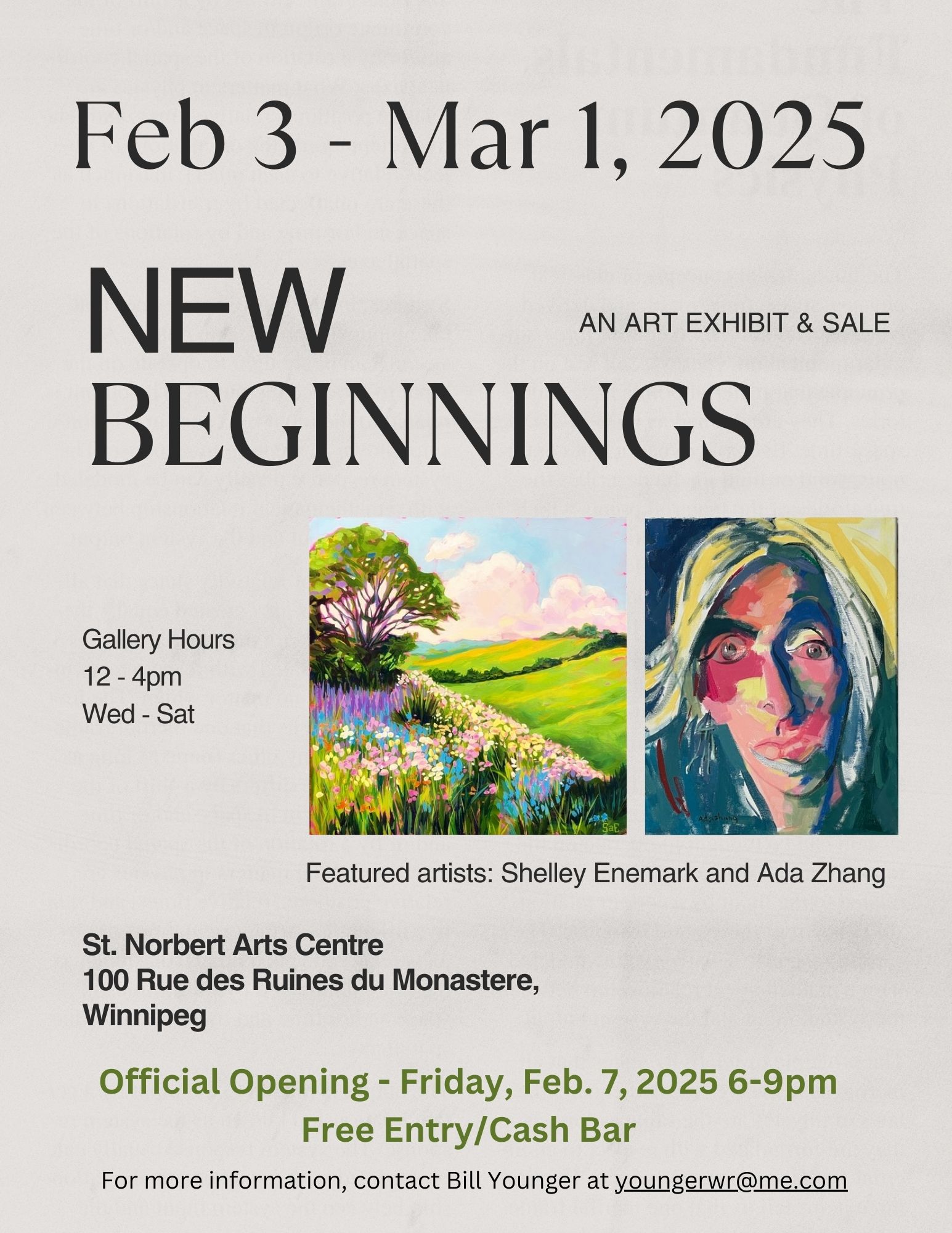 « All Events This event has passed. New Beginnings, An Art Exhibit & Sale 2025-02-03 – 2025-03-01 Add to calendar Google Calendar iCalendar Outlook 365 Outlook Live Details Start: 2025-02-03 End: 2025-03-01 Venue St. Norbert Arts Centre 100 rue des Ruines du Monastere Winnipeg, Manitoba R3V 1L6 Canada + Google Map Phone 2042690564 View Venue Website
